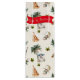 Saco de presente de Natal de praia para vinho, ou uma garrafa. Os "bonecos de neve" de areia de praia, árvores de Natal arenosas e palmeiras decoradas são parte do padrão que cobrir esta nave / bolsa de presente esbranquiçada. Um banner vermelho na frente reserva sua escolha de saudação. "Seas e Saudações" é o texto de exemplo na escrita.