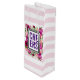 Saco de presente de vinho com um buquê floral composto por rosas de rosa claro e papoilas cor-de-rosa escuras com muitas folhas verdes e peludas. Um quadro em camadas acima com o dentro de texto. O fundo é um padrão de listras rosa-macio.