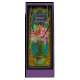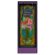 Anúncio de perfumaria francês "Bouduet d'orient higiet water" com um vaso de rosas e outras flores. Enquadrado em forma dourada e feito em cores vermelha, verde, turquesa, púrpura, âmbar e rosa. Interessante e único decoro para um saco de vinho.