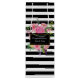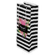 Lindas peônias rosa adornam a frente desta bolsa preta e branca listrada para vinho. Uma placa de texto preta, sobre as flores coloridas, tem texto branco personalizável. Rótulos de vinho combinando estão disponíveis.
