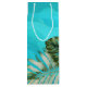 Saco de vinho alto com flores e folhas de hibisco tropical. Personalize com texto na frente. Design de ondas azuis aqua com flores amarelas e folhas da selva que envolvem o saco. "Obrigado por estar aqui" é a redação de amostra, em letra cursiva branca. Use como lembranças de casamento, presentes para chá de panela ou festa de noivado.
