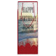 Uma canvas pintada com o soreno pôr do sol sobre o oceano, adornada com a saudação corajosa de "Feliz Aniversário Jesus" e embelezada com árvores de Natal que descansam sobre uma série de colinas vermelhas na base design.