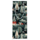A lush, snowy winter scene with white deer roaming in snow covered fields dotted with red and white farmhouses and surrounded by hearty winter pine trees.