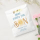 Esta bolsa de chá de fraldas de bonitinho mostra o texto "Aqui Vem O Filho" em tipografia retrô azul com um sorridente sol amarelo-aquarela. Facilmente personalizável. Original Watercolor © Michele Davies.