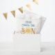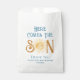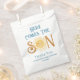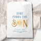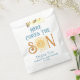 Esta bolsa de chá de fraldas de bonitinho mostra o texto "Aqui Vem O Filho" na tipografia azul na moda com um sorridente sol amarelo-aquarela. Facilmente personalizável. Original Watercolor © Michele Davies.