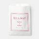 Simples, minimalista e chic nupa-mala de favoritos de casamento mostra um design moderno com uma dupla borda em vermelho magenta. Este design moderno oferece sofisticação clássica e eterno. "O amor é doce, por favor, faça um tratado" é mostrado junto com os primeiros nomes do casal e data do evento em elegantes letras e escritos vermelhos magenta. Estes são um acompanhamento perfeito para qualquer festa de casamento! Certifique-se de ver o link de coleção nesta página para exibir todos os itens correspondentes! Envie perguntas ou solicitações personalizadas para invitationsuites@gmail.com.