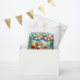 Criaturas de Woodland temem festa de aniversário para um menino ou menina. Esquilo de aquarela com balões coloridos em verde, amarelo, laranja, rosa, roxo e azul.