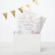 Aniversário Favorece Bolsas com um adorável unicórnio com asas, que está cercado por lindas imagens de um castelo mágico, nuvens e beliche festivo.