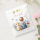 It's a Girl favors. Pretty watercolor style ai art depicting a back view of a baby girl sitting with her little puppy white Lab dog. They are surrounded by flowers, butterflies and birds. Colors used are pink, purple, red and blue. The baby girl is wearing cute little overalls and has some cute curly blonde hair.
