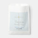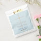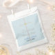 Batismo Elegante Filho Obrigado Papelão Bolsas Favorecidas com Uma Cruz de Prata pintada à mão com Destaques Dourados. Personalize o nome no script azul e data no texto preto contra um fundo azul claro. Clique em Personalizar para Editar tamanho ou cor da fonte. Trabalho de arte gráfico original e Design © TamiraZDesign.