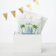 Bebê no conselho surfando, chá de bebezinho azul. Prepare-se para celebrar a chegada empolgante de um menino com este tema charmoso do chá de bebê inspirado pelo oceano. São apresentados três pranchas de calmantes tons de azul, juntamente com palmeiras altas e raios solares radiantes. O pano de fundo azul-claro suave mimetiza uma suave brisa oceânica, acentuada por um pop de refrescamento da água azul-aqua, estabelecendo uma atmosfera pacífica, ideal para acolher o pequeno surfista futuro.