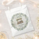 Lindo design de Chá de Noiva no Mercado de Produtores com floresta e verde-sage e eucalipto e boutique "Ela está Fresca do Mercado". O fundo envelhecido rústico combinado com o suporte de madeira carregado de verde e o eucalipto suspenso ao redor lembra um mercado italiano ou rural ao ar livre.