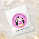 Diga obrigado aos participantes de seus primeiros aniversários com essas bolsas de favores caprichosos, que apresentam adoráveis pinguins bebês em forma de ovo esporcendo flores rosa rosa em um fundo rosa estrelado! Design © W.H. Sim. Mais informações em zazzle.com/expressionsoccasions