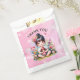 Obrigado de festa de aniversário de garota você favorece bolsas. Menina asiática bonita sentada em flores cor-de-rosa segurando uma boneca.