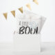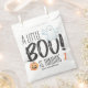 O tema do Dia das Bruxas favorece bolsas para o aniversário de outubro traz "Um Pequeno Boo está virando...." tipografia com um fantasma de aquarela fofo e sotaque de lanterna e escrita à mão. As cinzas e as cores laranja são perfeitas para uma menina ou um menino. Arte da KL Stock.