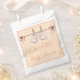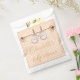 Calçados bonitas de bebê amarradas a uma linha de cordas rústica. Pasta polka-ponto com nome e evento personalizáveis. Borda de pêssego.