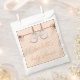 Calçados bonitas de bebê amarradas a uma linha de cordas rústica. Pasta polka-ponto com nome e evento personalizáveis. Fronteira castanha quente.