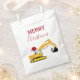 Uma bela ilustração de uma escavadora de brinquedo amarelo vestindo um chapéu de Papai Noel e decorado em luzes de Natal cavando alguns presentes de Natal com palavras "Feliz Natal". Perfeito para amantes de caminhões de construção de todas as idades. Um saco ideal de natal para entusiastas de caminhões escavadores grandes ou pequenos, raparigas ou rapazes.