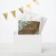 Estas bolsas de boho-aquoso, cor-de-água russa, a favor de casamento botânico apresentam buquês de verde-sábio eucalipto verde que decoram um quadro geométrico dourado, com um fundo de madeira rústica.