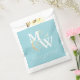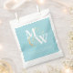 Elegante Monograma Dourado Vidro Mar Teal White Wedding Favor Bag. Personalize com suas iniciais do monograma da Noiva e do Groom, noiva e nomes de noivos, data do casamento em branco sobre o quadrado azul do mar azul. Convidamo-lo a visitar a nossa loja Zazzle, Beachy Design Co, para ver a suíte de casamento de cheio. Entre em contato conosco se precisar de assistência.