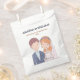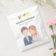 A bolsa de favores do casamento apresenta uma ilustração encantadora de uma noiva e noiva. O noivo é representado por cabelo castanho curto, uma cor clara, e está vestindo uma jaqueta de terno azul marinho sobre uma camisa azul clara colada e uma gravata branca. Ele tem um pequeno butonniere preso à sua lapela. A noiva está ao seu lado, sorrindo doce. Ela tem cabelos ondulados, cor de laranja avermelhada adornados com uma coroa floral de cor rosa, laranja e flores brancas. Um delicado véu branco corre atrás dela. Ela está vestindo um vestido branco de casamento com uma linha de pescoço e um colar de pérolas. Esta ilustração simples, parecida com cartoon sugere uma ligação amorosa entre eles. É caprichoso e carinhoso, dando um tom alegre para o próximo casamento.