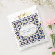 Este design apresenta padrões de azulejos portugueses de vintagem russa. O texto do casamento é elegantemente enquadrado com uma forma de arco oval de cor branca e dourada. Azulejo único, azul, amarelo e branco geométrico, design de bonés floral com elementos modernos. Os convites de casamento e outros artigos de papelaria também estão disponíveis.