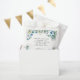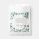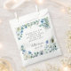 Flores brancas e alegres e folhas verdes de aquarela formam uma bela borda neste bonito saco azul floral de casamento da primavera. Chic, belas bolsas de casamento de jardim para seus convidados em uma recepção ao ar livre.