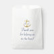 Continue o tema clássico do ouro e marinho azul náutico com estas bolsas de casamento. Uma âncora de ouro é flanqueada com os monogramas da noiva e do noivo. O texto azul decorativo e marinho obrigado seus convidados por ajudá-lo a celebrar seu dia especial. Sinta-se livre para mudar o texto e adicionar seus próprios pensamentos especiais.