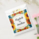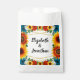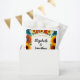 Design floral elegante e colorido para um evento de verão no quintal. Apresenta rosas azuis, margaridas brancas, flores silvestres vermelhas e girassóis com quadro geométrico dourado