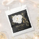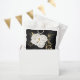 Flores brancas elegantes com folhas de ouro românticas em fundo preto, bolsa de favor de casamento