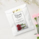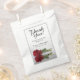Estas belas bolsas de casamento são uma forma excelente de obrigado aos seus convidados por fazerem parte do vosso dia especial. A design apresenta uma rosa vermelha longa e solteiro sobre o lado e refletindo numa piscina de água com ondulações e ondas. A legenda diz: Obrigado por comemorar conosco. Há espaço para os nomes do casal e da data do casamento.