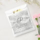 Design apresenta um fundo branco faux-satin para o monograma do casal recém-casado. O centro exibe o sobrenome inicial em uma fonte grande, elegante, prateada. A primeira inicial de noiva e noivo é exibida em ambos os lados na mesma fonte, mas menor.