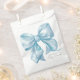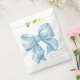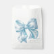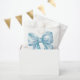 Um design encantador de sacola de lembrancinha de festa com um grande laço azul em aquarela centrado na frente. O nome da futura mamãe é exibido em uma fonte serifada clássica na parte inferior, com "Baby Shower" escrito elegantemente abaixo em caligrafia manuscrita.