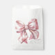 Um design charmoso de sacola de lembrancinha de festa com um grande laço rosa em aquarela no centro da frente. O nome da futura mamãe é exibido em uma fonte serifada clássica na parte inferior, com "Baby Shower" escrito elegantemente abaixo em caligrafia manuscrita.