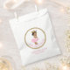 Sacolas de lembrança para chá de bebê princesa étnica com adorável bebê étnica vestindo tutu de bailarina cor-de-rosa, colar de pérolas e coroa dourada. Você pode adicionar o texto de sua escolha a esta adorável sacola de presente de chá de bebê princesa cor-de-rosa. Este é um design impresso sem brilho real, pérolas, etc.