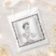 Sacolas de lembrança para chá de bebê princesa com adorável bebê menina vintage vestindo calças com babados rosa e coroa em um lindo fundo de renda rosa. Você pode adicionar texto para personalizar essas adoráveis sacolas de lembrança para chá de bebê princesa, e você pode excluir o texto É uma Menina.