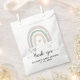 O chá de fraldas de Boho é a favor de uma bolsa com uma abstrato de aquarela bonitinha de um arco-íris verde, laranja e lavanda com corações e "obrigado você" em um roteiro na moda. Personalize com o nome da futura mãe e a data do chá.