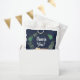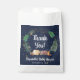 Um chá de fraldas bonitinho favorece bolsas que apresentam uma ilustração de animais da floresta com sua tenda acampando nas montanhas e na floresta sob um céu azul estrelado à meia-noite e "Obrigado!" e o nome da futura mãe em um roteiro branco.
