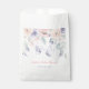 Papel de chá de fraldas de borboleta giro favorece bolsas com flores de água roxas e cor-de-rosa com letra de caligrafia.