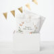 O produto de chá de fraldas temático florestal entonado apresenta uma borda aquarela de verde, cogumelos e borboletas. Personalize com suas informações ou clique em "Clique para personalizar mais" para editar estilos de fonte, tamanho e cores.