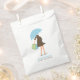 Adorável chá de fraldas a favor das bolsas apresenta uma doce ilustração de uma futura mãe segurando duas malas de compras e um guarda-chuva.
