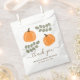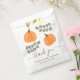 Um chá de fraldas neutro entre gêneros favorece as bolsas. Este design apresenta uma fonte moderna de escrita de caligrafia, abóboras laranja e ramos verdes de Eucalipto.