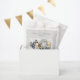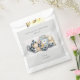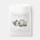 Bolsas de favor adoráveis para o próximo chá de fraldas, com animais recheados com uma chaleira e chá preto e branco, relógio de alarme vintage e um papel de parede de design floral suave no fundo - a festa perfeita do chá! Atualize o texto para atender às suas necessidades.