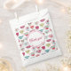 Um pastel moderno toma porcelana de porcelana ou xícaras de chá de porcelana bonito. Excelente coordenação favorece as bolsas com texto personalizado para combinar a celebração do chá de fraldas. Arte original de Nic Squirrell.