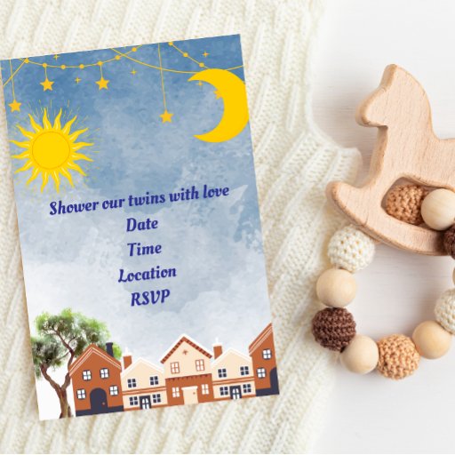 Uma bolsa de favor encantadora para o seu chá de fraldas duplo. Um fundo noturno escurecido de cor d'água com o sol, a lua e as estrelas a sair para jogar.