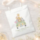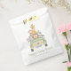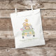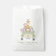 Um belo saco de favores de um partido neutro em termos de gênero que apresenta uma ilustração em aquarela de bebês (leão, elefante, zebra, macaco e girafa) empilhados num veículo safari e "Muito obrigado!" e o nome da mãe num roteiro verde-selva.