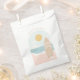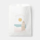 Este surf bonitinho e moderno, bolsa de favores de praia, apresenta uma prancha de pau na praia com conchas espalhadas.