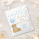 Chá personalizado de bebê bonito favorece bolsas com um ursinho de pelúcia a cores-d'água com buquê de balão de arco e coração e borda de terra estelar em azul. AJUDA: para obter assistência com a modificação/personalização do design, transferindo o design para outro produto ou se você quiser coordenar itens para a sua experiência de chá de fraldas, entre em contato com o designer ANTES DE PEDIR por meio do Zazzle Chat ou makeitaboutyoustore@gmail.com.
