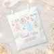 Sacolinha de lembrancinha para Chá de Noiva Floral Elegante Roxo e Azul. O texto pode ser alterado para atender às suas necessidades.