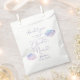 O Dreamy chá de panela favorece o saco com ilustração aquosa de nuvens cor-de-rosa, roxa e azul com um texto tipográfico que diz "a noiva está na nuvem nove".